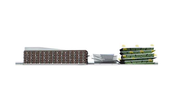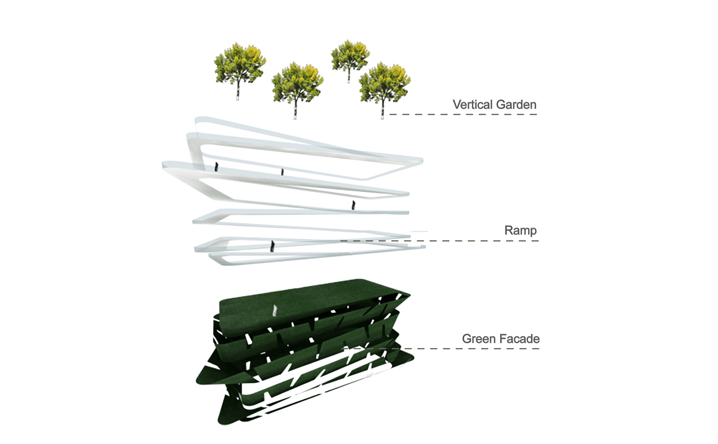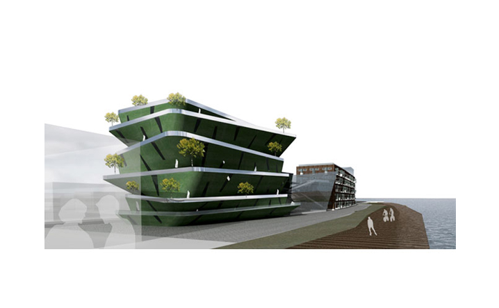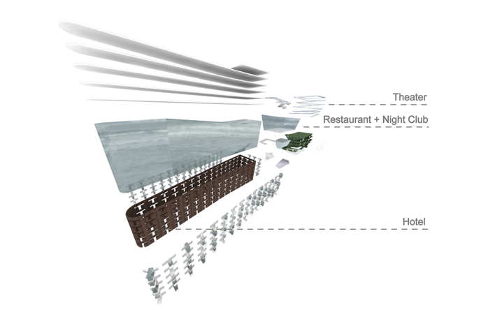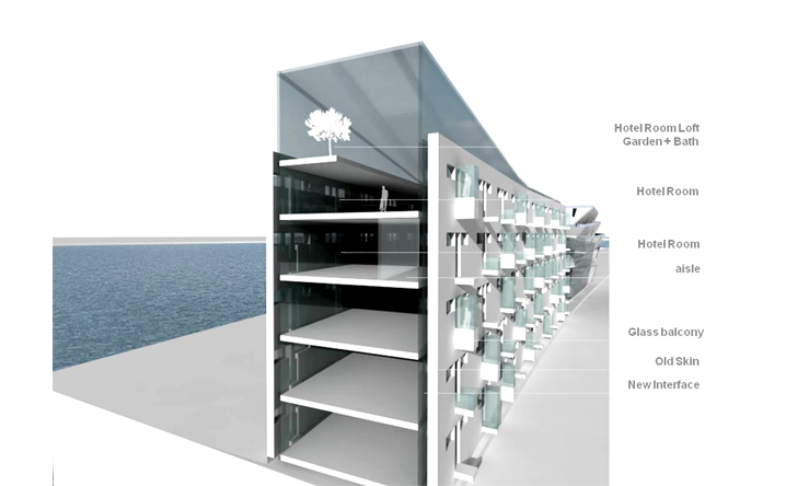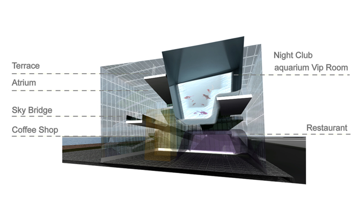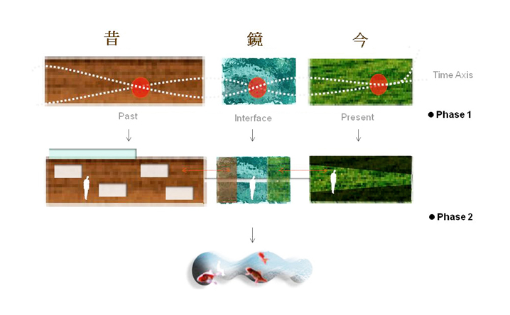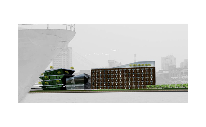 老碼頭位於上海十六鋪碼頭,亦是開滬碼頭,在歷史上具有相當的意義。本案延續MAA對於歷史建築的操作態度,以”昔、鏡、今”的時間軸概念完成設計配寘。在第一棟(昔)舊建築中保留原本裡面,並重新在空間內規劃精品酒店。頂樓配寘全新的天空的江景別墅空間形式;第二棟(鏡)以半穿透和半反射的資料皮層構築出特色餐廳和水族館酒吧的室內空間,在反射和穿透中,呼應著第一棟、第三棟所代表的”過去及現在”,模糊介面中透過空構連接形成時間軸概念裏戲劇性的穿越過程;第三棟(今)以垂直綠化和都市的連續立體開放空間去形塑一個獨特的表演劇院,傳遞著當代建築所承載,對於都市和環境議題下的使命,人們可以借由動線安排以及全新的空間使用經驗,對”昔、鏡、今”產生理解認知,進而想像未來。