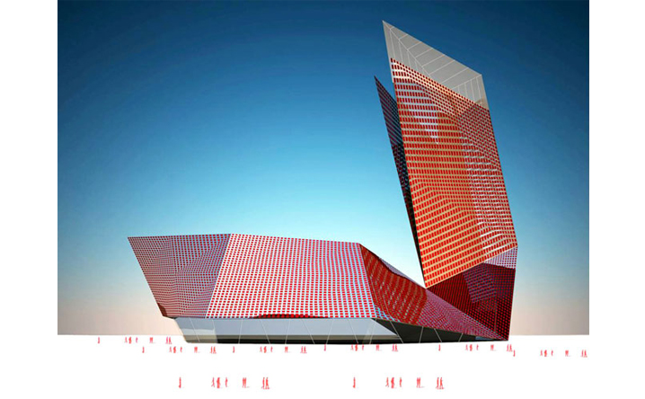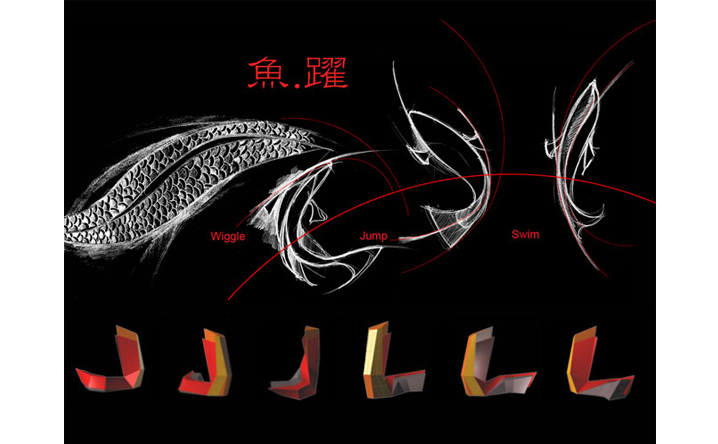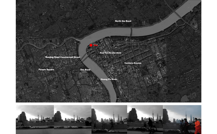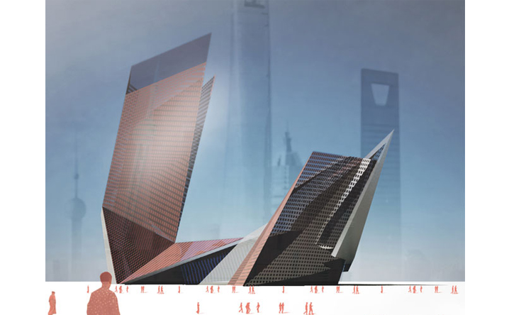 本案位於上海陸家嘴金融區黃浦江畔第一排首棟,在東方明珠大樓旁的位置,可說是座落在上海甚至是全中國極具重要性、代表性的都市意像位置。不斷在高度上競逐的陸家嘴天際線中,我們在初步概念設計中嘗試在寓意和形態上突破基地條件限制,將建築的形態透過不斷操作化身為躍出黃浦江的一條魚,取自中國傳統文化中魚躍龍門的寓義,並在魚鱗狀建築立面上透過裐印玻璃,印上中國的特有紅色與方案通過時象徵中國人口數量的網點。在陽光下透過光影反射出該建築特有的光影,在凝固的動態瞬息間重新定義和活化陸家嘴的天際線。