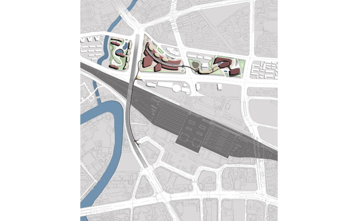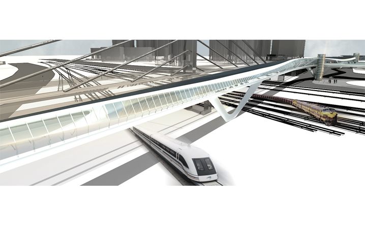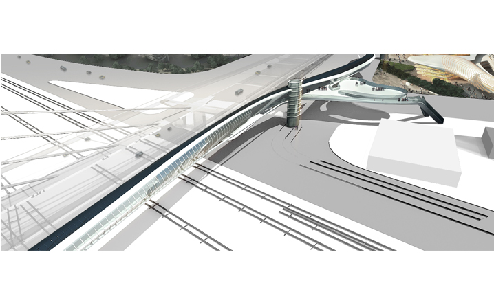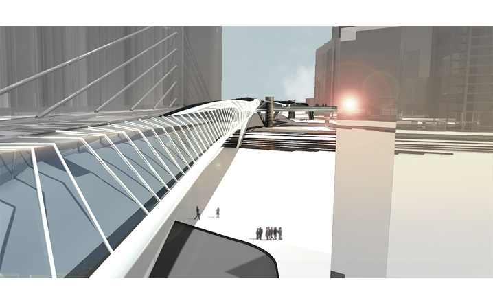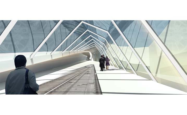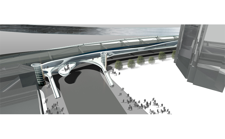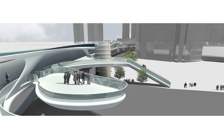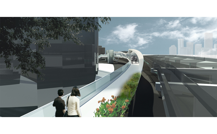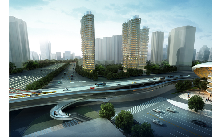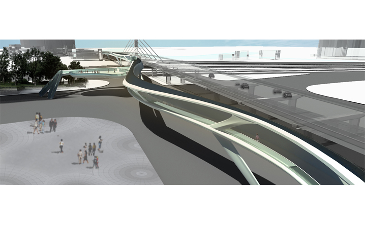 本設計承接中興路開發案之脈絡,在因開發先後與交通人流等都市函構中彼此逐漸抽離的南北廣場之間,我們植入同意富律動感與自由流線的連系空橋。空橋的各節點同時設計為能駐足停留、觀景展演、擁有商業廣告、多媒體互動可能性的浮島。進而創造有別於往昔一般的徒步行走空間體驗。