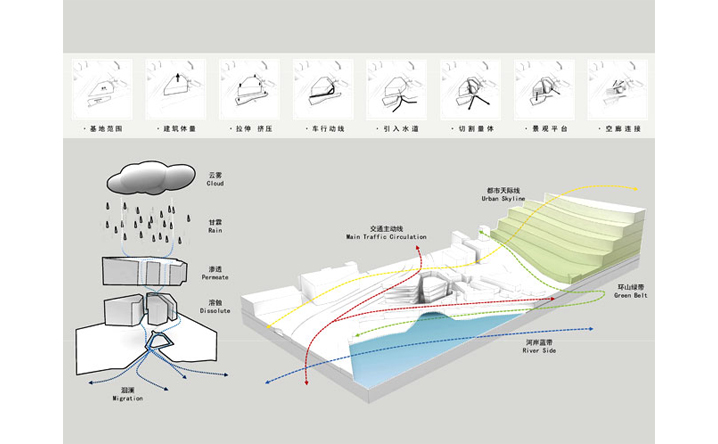甲方: 三寶建設開發集團 基地位置: 中國桂林 基地面積: 2133㎡ 建築面積: 4418㎡ 設計時間: 2011 我們將桂林山水的山與水抽離出來成為兩個主要的設計元素,將基地建築量體視為山峰奇石,透過雲露似水:滲透、溶蝕、洄潤等概念將其塑型成峰。依照基地周邊的都市藍帶與交通動線配寘出主題性强、高端雅致而能供政府接待、交流頂級商務資訊的機能性平台。