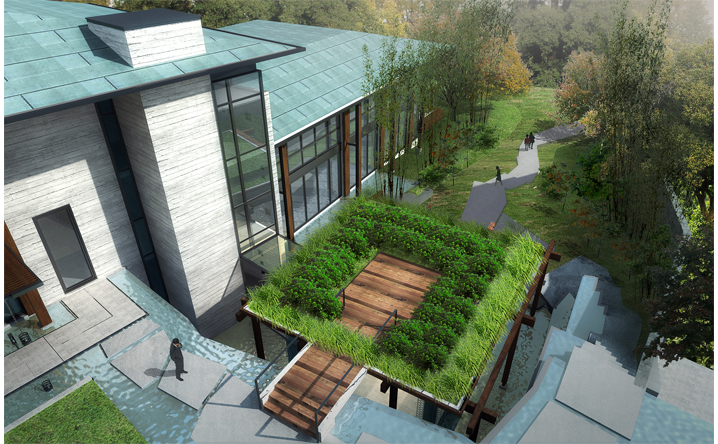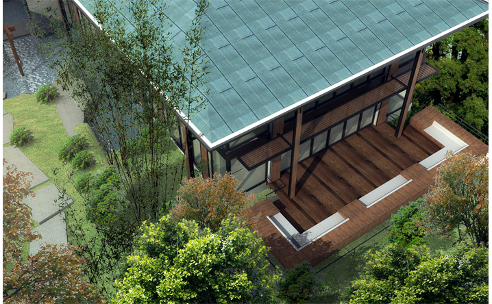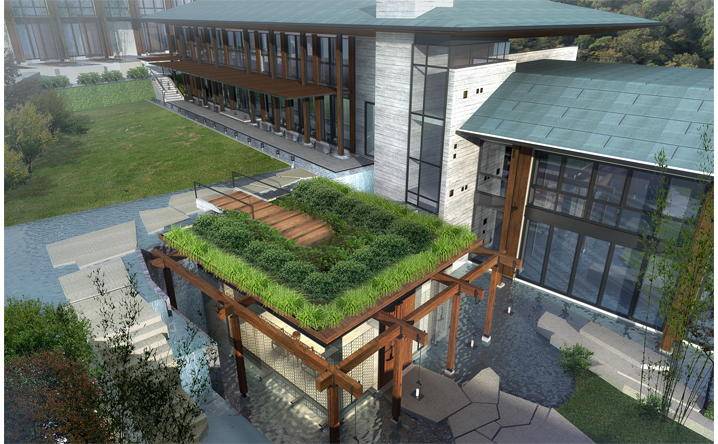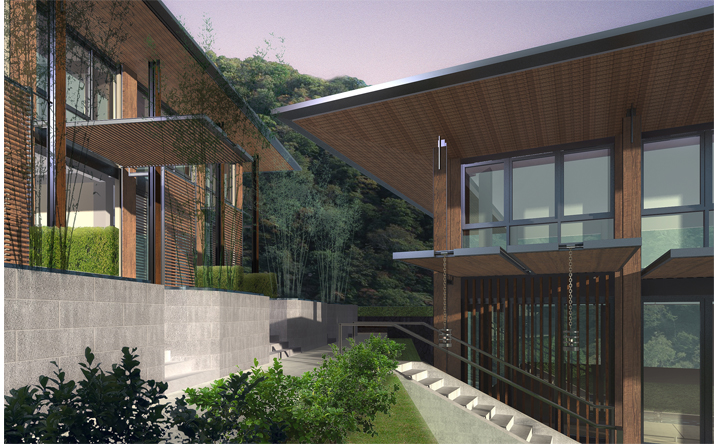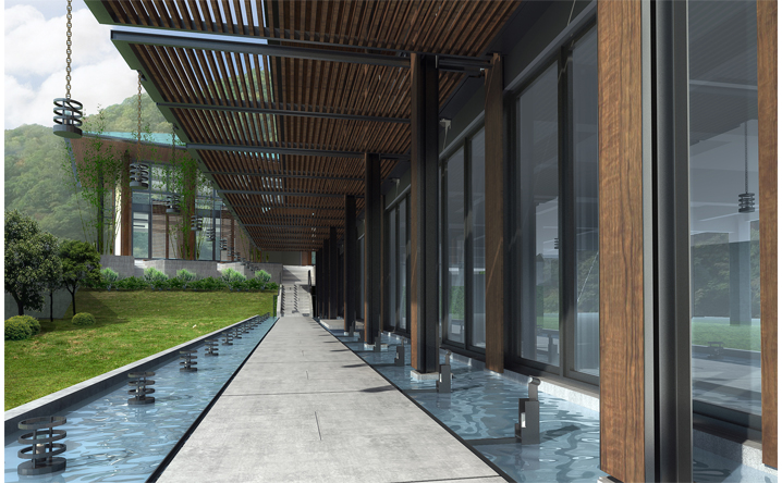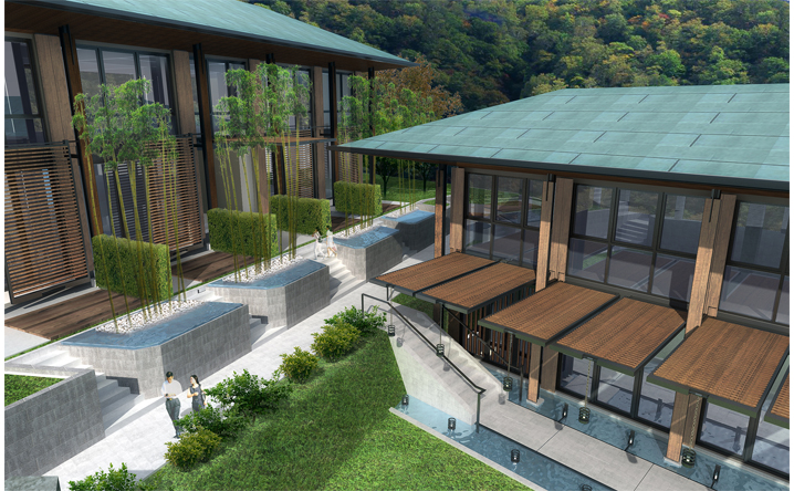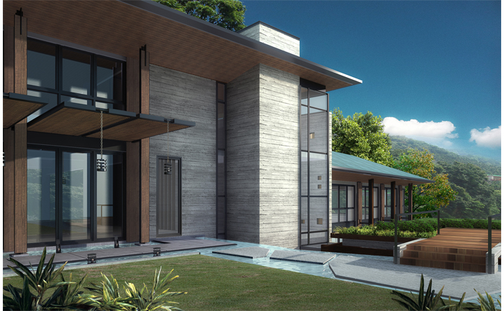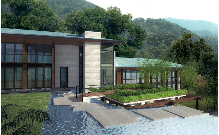 建築材料的部分,為反應基地環境,我們以木材與石材等天然材料為主,搭配金屬板與玻璃,並以綠銅為屋頂資料:隨著時間推移,屋頂表面漸漸氧化成銅綠,直至主色與風景融合,成為白雲山的一部分。以天為被,以地為枕,這是白雲山頂級別墅會所最高境界的詮釋。