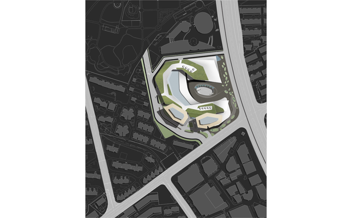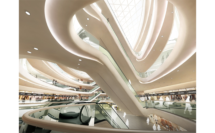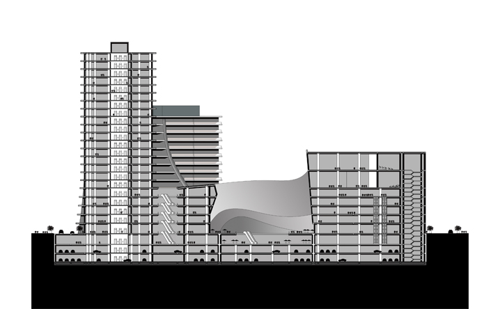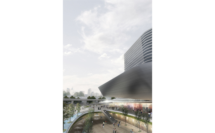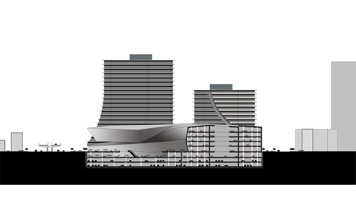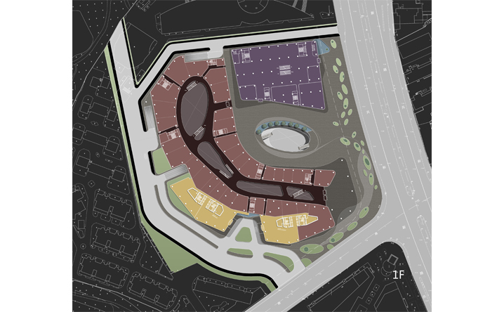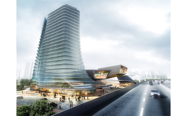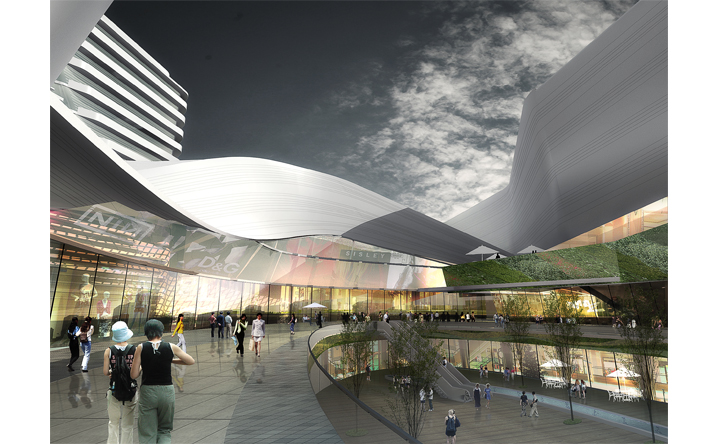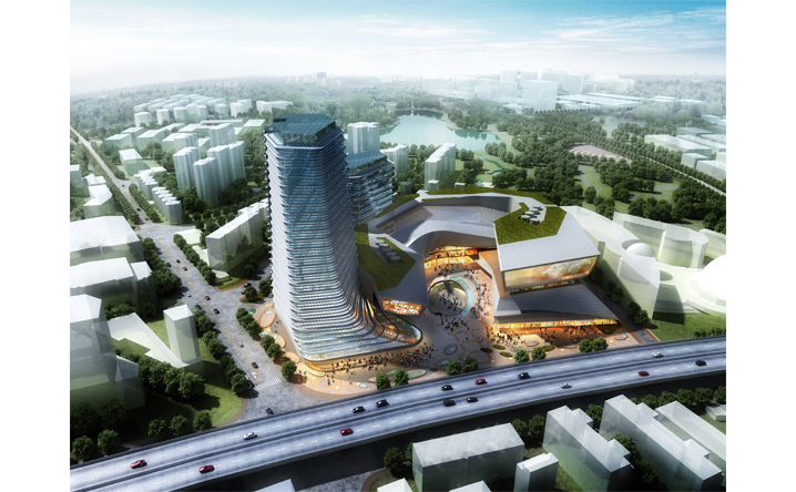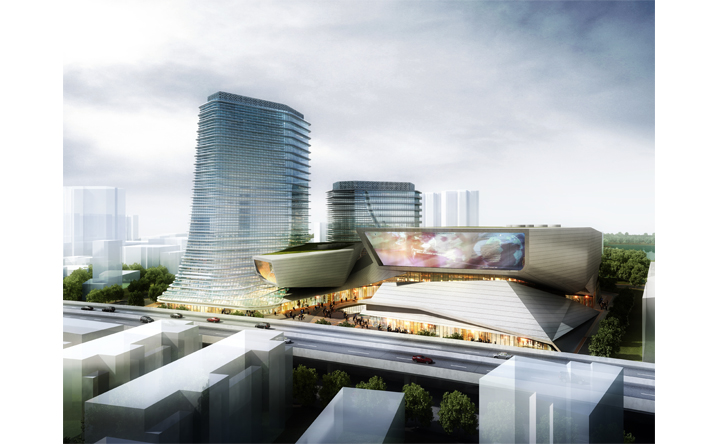 本地塊位於北依上海馬戲團南靠閘北大寧商場東臨南北高架,在已發展成熟的大寧國際商場旁要重新擬定寫字樓和購物中心及百貨商場的新空間計畫是相當具挑戰的,MAA本次設計旨在將此地塊形塑出閘北新都市意象與打造成地標建築,透過流體的建築的型態打造出地塊律動的天際線,利用寫字樓的高度在建築型態上連續到商業面, 延伸出商業的新可見度與地標性,在立面表情上創造高辨識度的商業建築意象與都市的互動表面與空間,利用完整的空間策略創造一個充滿活力的高端商業、辦公及時尚流行藝文中心。在商業的佈局有以下的策略: 回游:提供清晰的商業逛選路徑;集氣:將5A辦公室位置的佈局和大寧商場的對應位置讓集氣形成地標和開展出寫字樓的視野;競合與縫合:將大寧商場和周邊碎化的空間縫合後開始聚合:控制不同開放空間密度與型態進行空間的串聯和活動的豐富度將整個區位的商業整合。我們亦希望將此地塊成為可持續性綠色建築的開發典範透過L.E.E.D國際可持續性綠建築準則的規劃實踐與都市綠色廊道的串聯,並透過空中立體綠化的執行和大寧綠地的延伸,創造上海高品質都市生活環境的實踐。