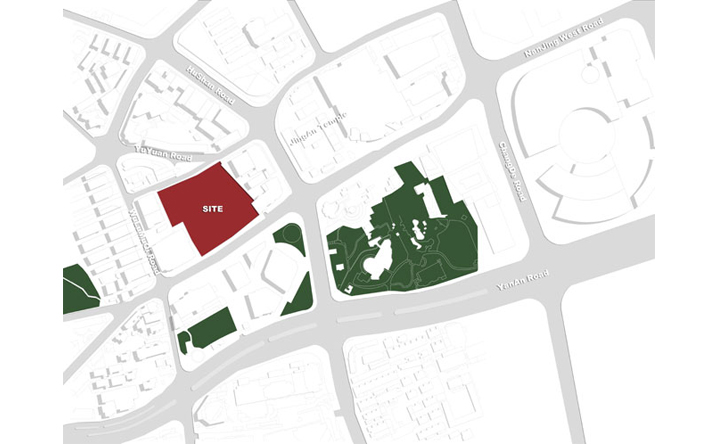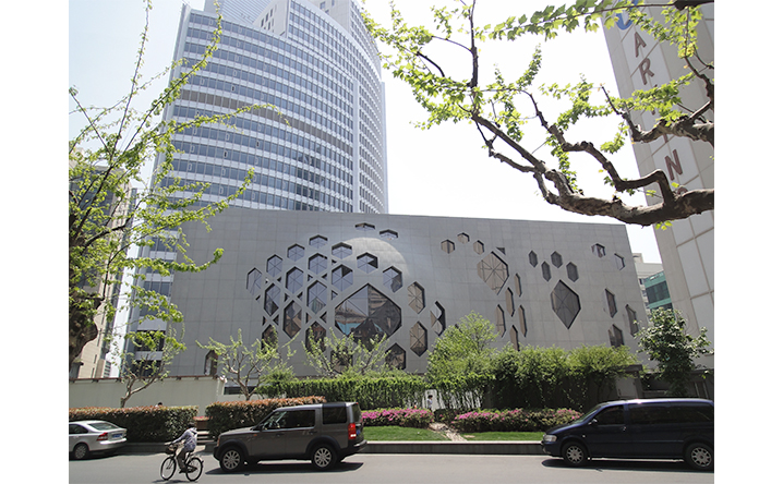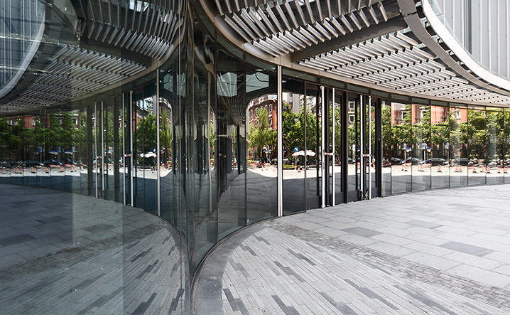 本案當時從初始景觀設計到門廳的室內設計和後續裙樓及主樓裡面設計任務,屬於不同階段收到的任務書,意即本設計需要在先前設計單位所設定的既有框架下,同時滿足及解决業主、政府規劃組織、都市函構等等,各面向對既有方案的問題與需求。在種種複雜限制中,我們提出了十數種方案不斷溝通。最後將本案景觀設計的山水流動概念,延續到建築立面,透過裙樓立面位置的退縮,使流動的連續性得以延續,突顯出商業入口不再被主樓阻擋。除了南京西路都市的流動性被强化外,同時透過立面和建築設計的重新導引,將都市活力延伸到愚園支路上,解决原本商業和辦公室量體互相干擾的最大問題,創造上海都市中全新的建築表情。