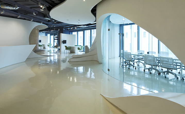 景觀為源自大樓覈心山水擬態中的流動風景,將地坪、雕塑、植栽、燈光及景觀元素以及人群動線的巧妙安排,轉化成在湍流中溯源的魚群,行成和建築,室內外空間緊密相扣的地景向度。